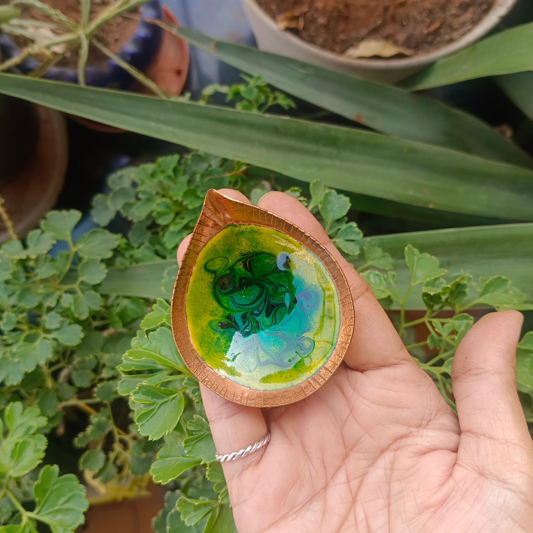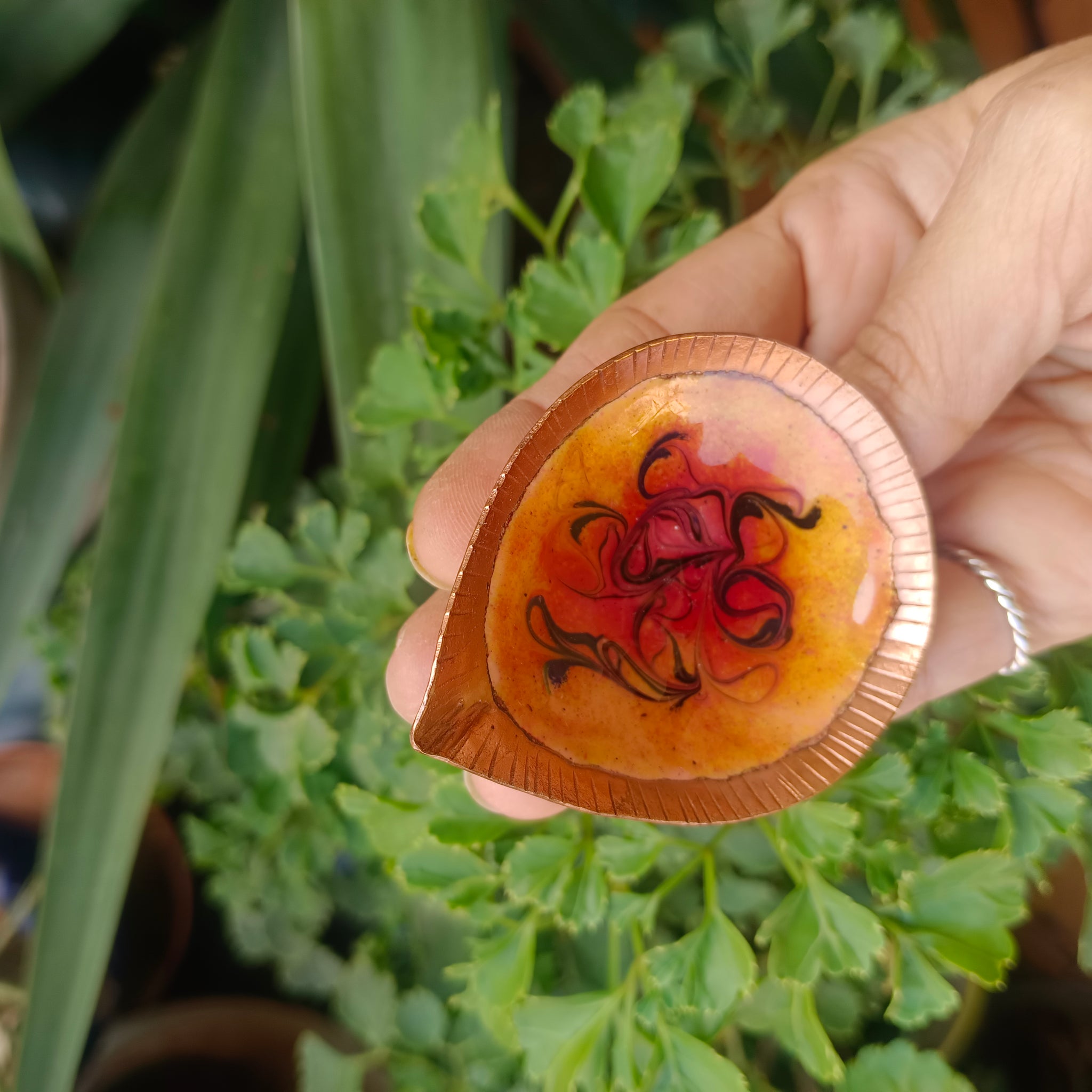 About the craft- The craft of copper enamelling involves fusing glass onto copper surface. Powdered glass is spread on the copper surface in the desired style and then heated at 700-900° C which melts the powder and coats the surface.this process prevents the copper from oxidising and imparts vibrancy to the surface.