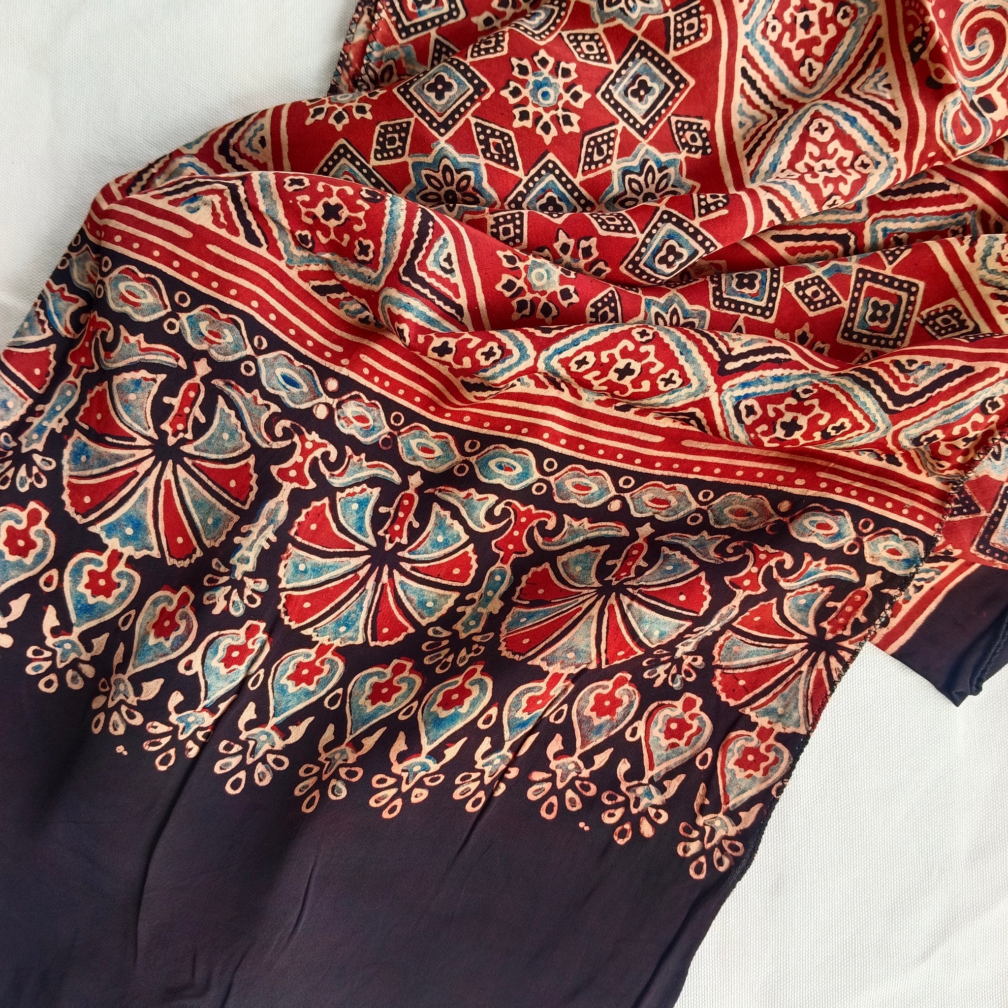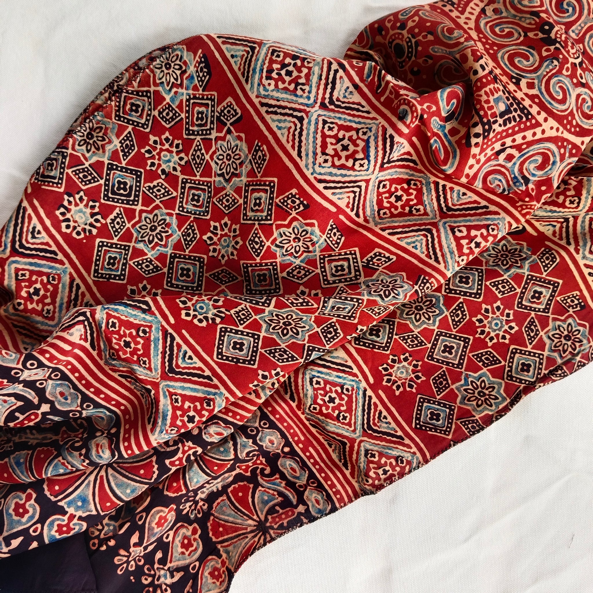 This is a stunning Ajrakh stole to pair up with plain kurtas or jeans. Soft modal fabric stoles are great for gifting too. You can pair it with any of our wallets in Ajrakh as a gift for a loved one.