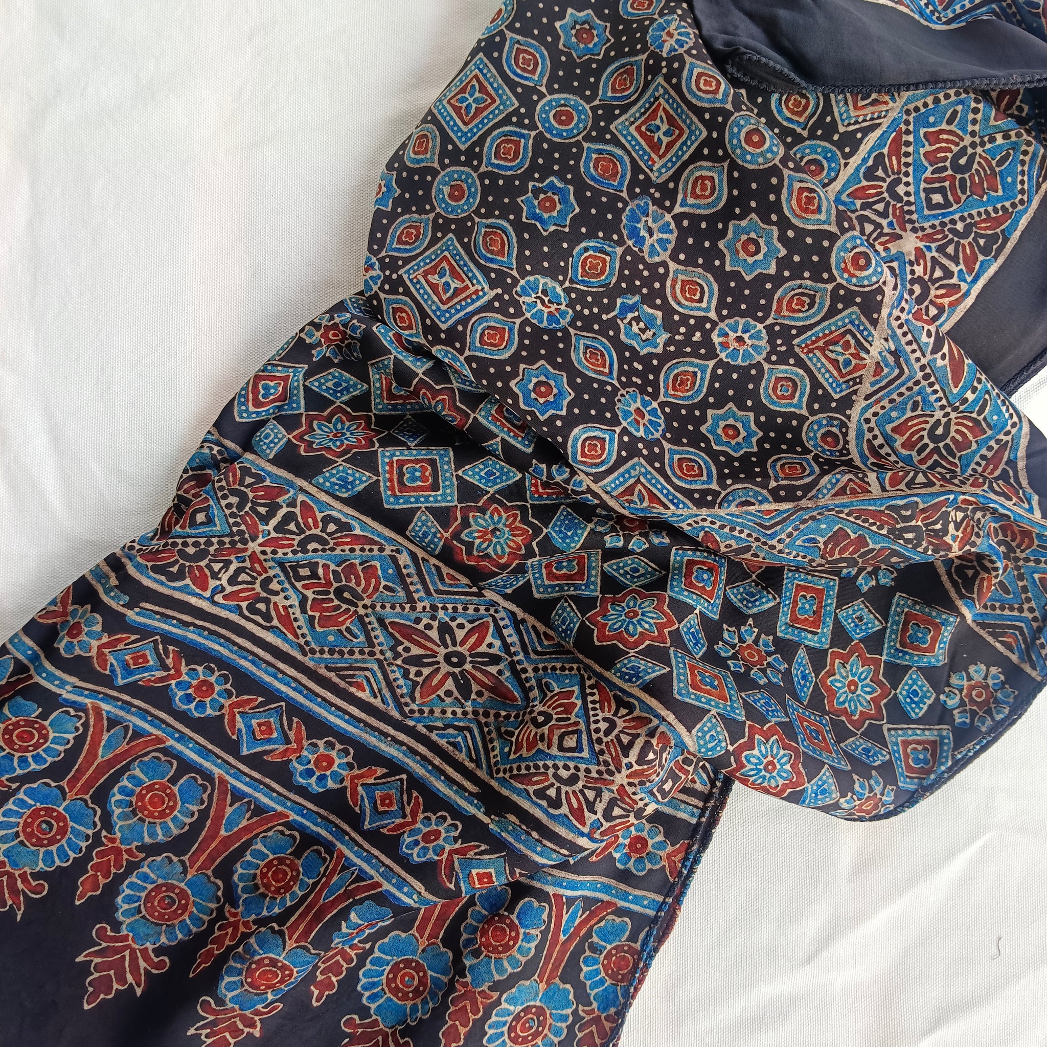 Ajrakh is an ancient block printing art that is unmatched in skill. Distinguished by its complex floral and geometric patterns, its painstaking printing process makes it a treasure to behold. Made by artisans in Ajrakhpur, Kutch; it is a craft which has survived for centuries.