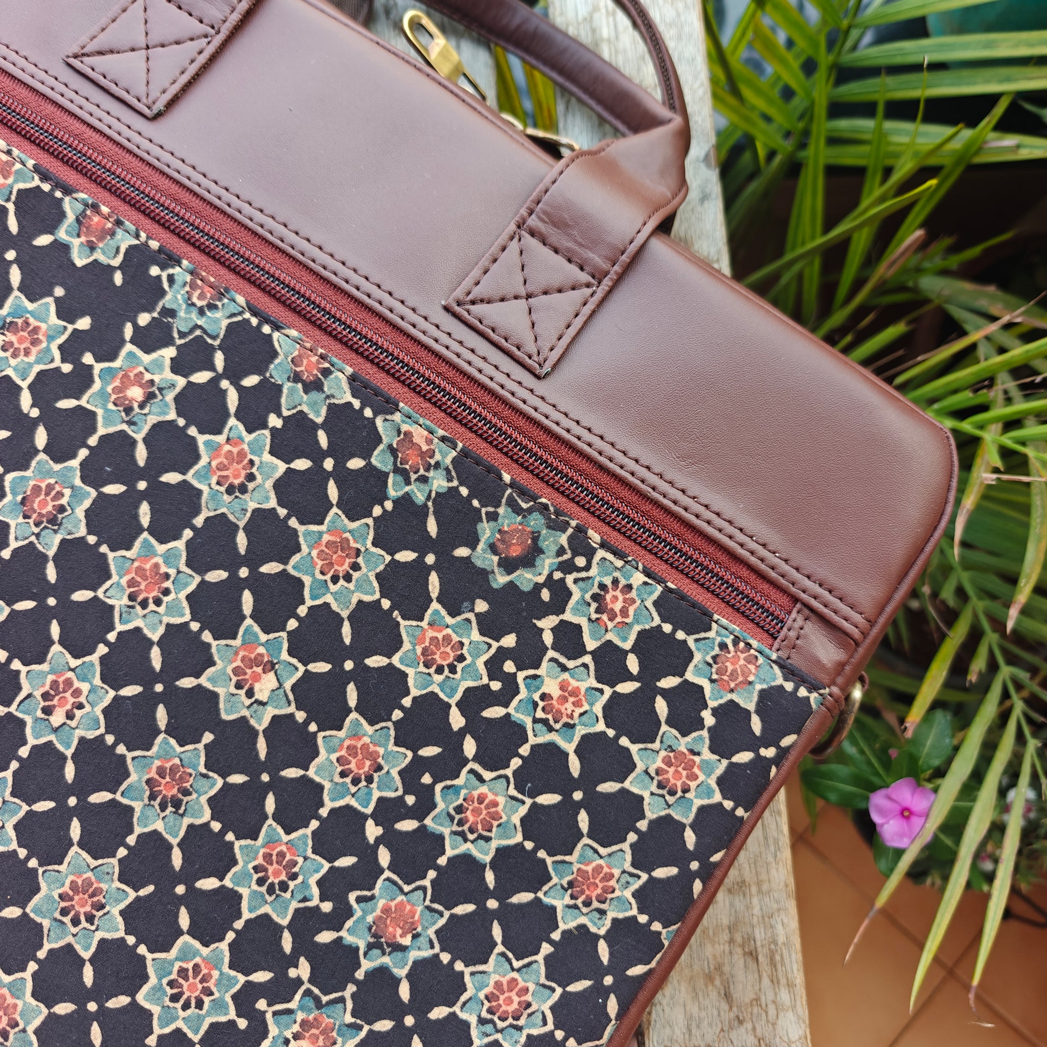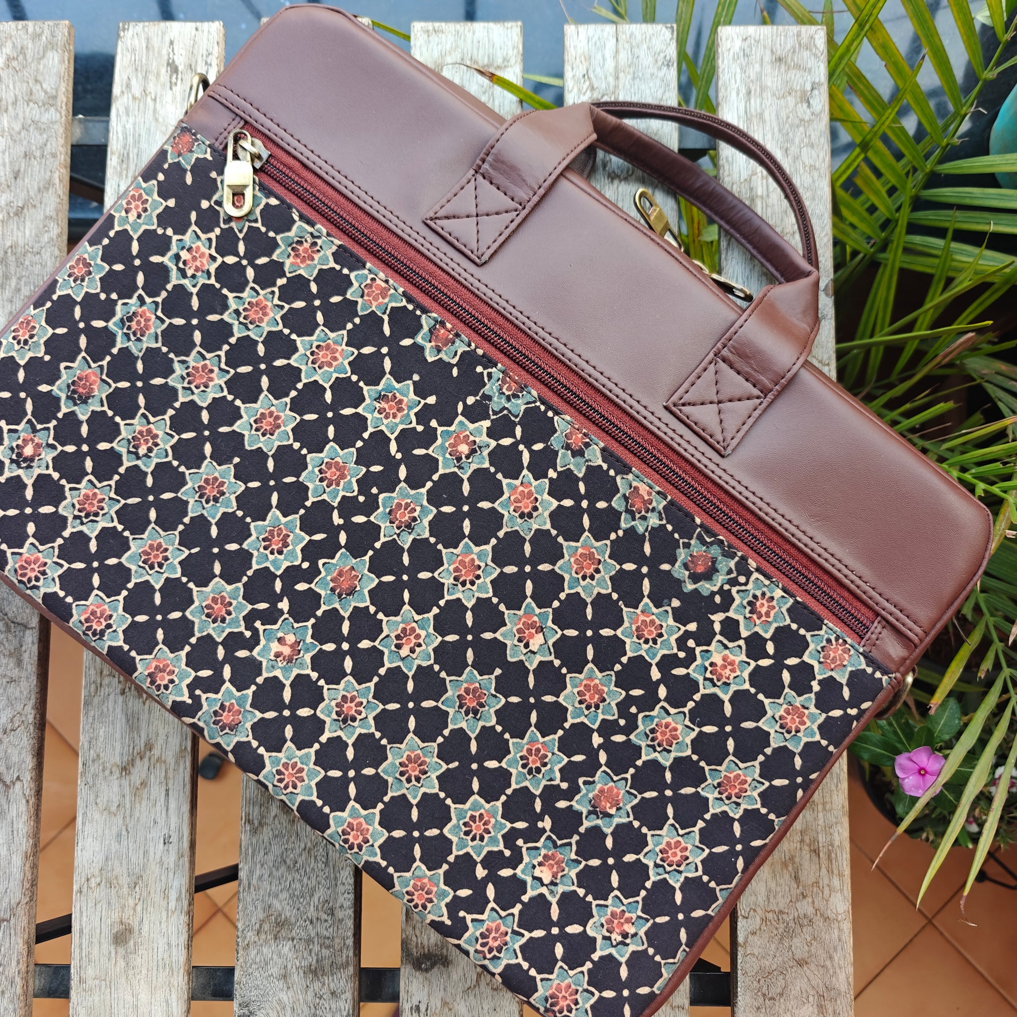Practical and chic ajrakh laptop bags for the workplace. It is apt for large as well as medium size laptops. Internal cushioning for screen protection.